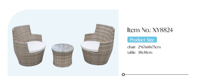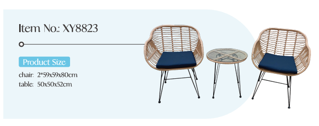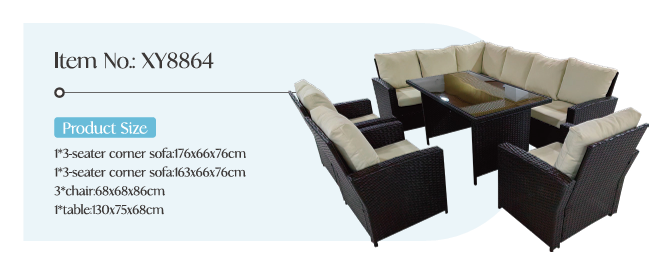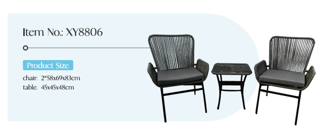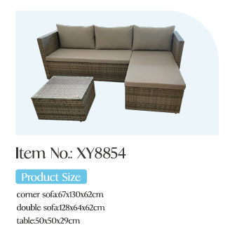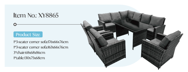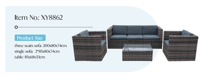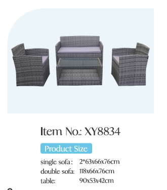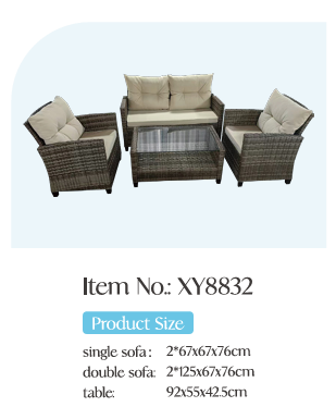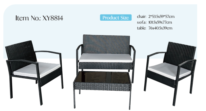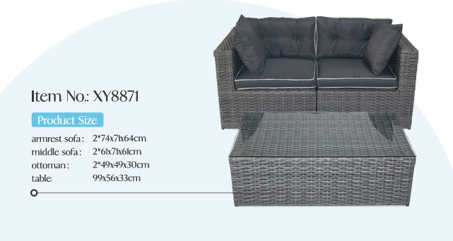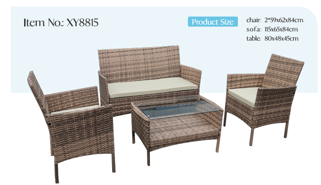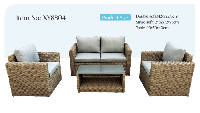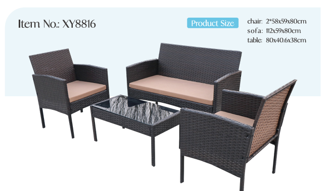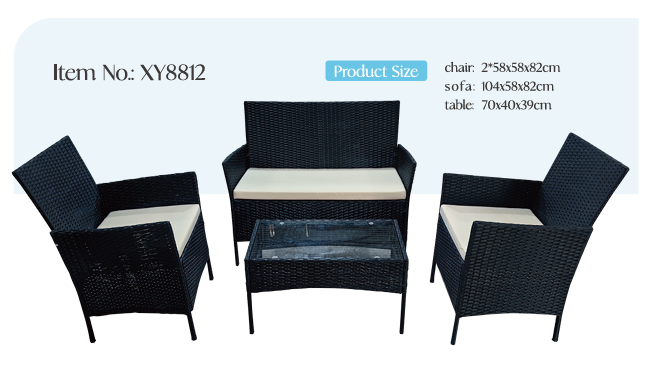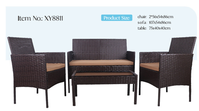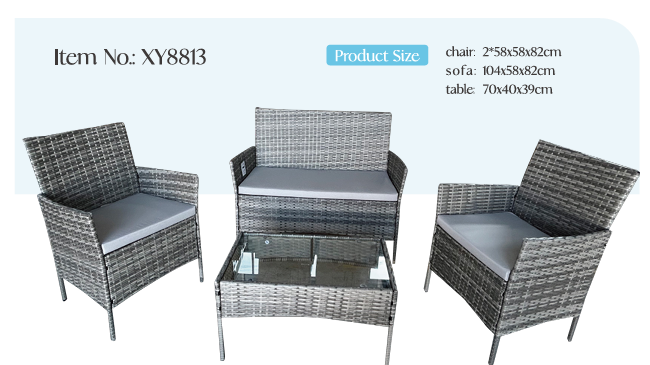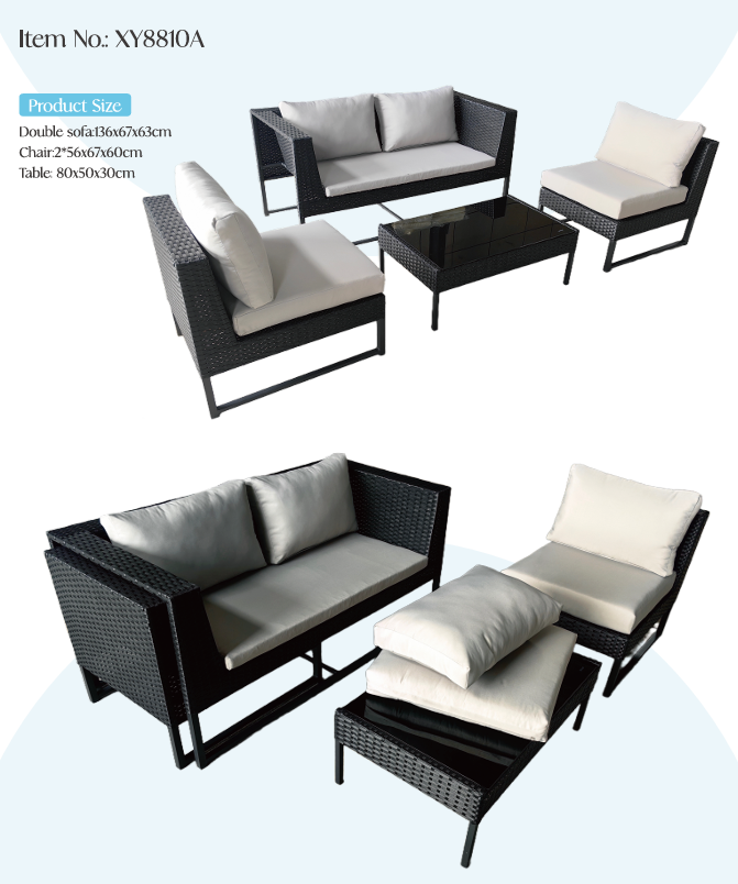 Our outdoor furniture products are mainly KD sofas, tables and chairs. These products use galvanized iron pipes with powder coating and are hand-woven with PE rattan.